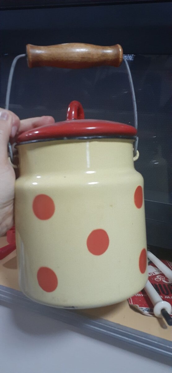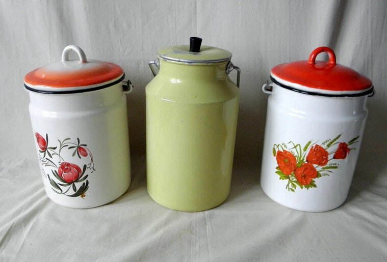 Любой советский ребенок обязательно помнит эмалированный бидон, с которым посылали купить молока. У нас был желто-оранжевый в горошек, он у меня и сейчас на кухне стоит. Самое интересное, что уже после Советского Союза мы купили набор кастрюль с точно таким же узором.