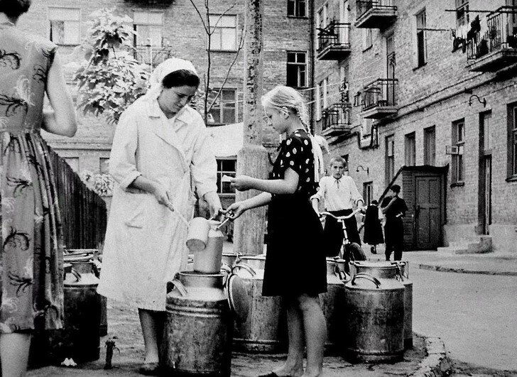 За молоком посылали в основном детей, при этом приказывали не бежать, смотреть под ноги, бидон не вертеть. И обязательно деньги положить в карман (даже не выпускали, пока не увидят, что рубль или мелочь без сдачи положена в кармашек).