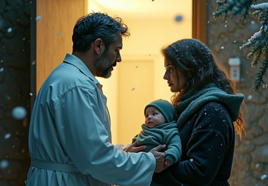Вадим вскочил, чуть не опрокинув чашку на выцветший ковер, и бросился к двери. Мысли вихрем закружились в голове: кто мог оказаться на улице в такую погоду? Может, авария на трассе? Или кто-то заблудился в снежной мгле? А вдруг человеку срочно нужна помощь врача? «Иду, держитесь!» — крикнул он, нашаривая ключ в кармане халата. Распахнув дверь, он едва устоял от порыва ледяного ветра, ворвавшегося в теплый дом. На пороге стояла молодая женщина, закутанная в потрепанное одеяло, из-под которого торчали мокрые края длинной юбки. У ее ног лежала промокшая сумка, а в руках она сжимала крохотного ребенка, чей плач был похож на жалобный писк котенка.